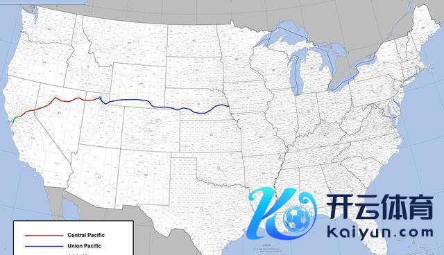 ▲太平洋铁路(分蓝红两条线),终末到达的场合是旧金山湾。